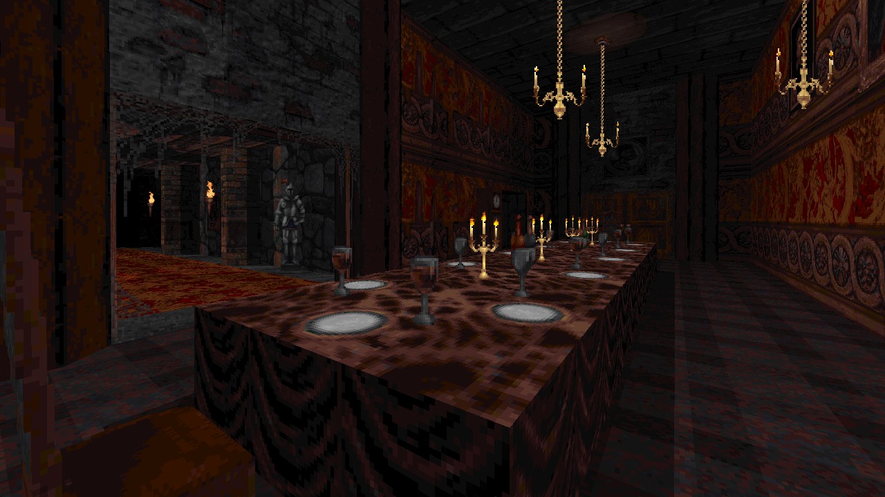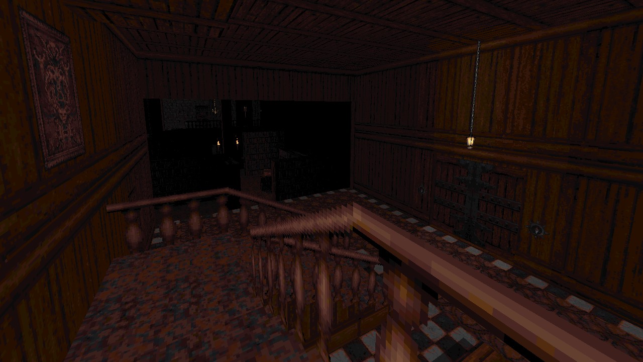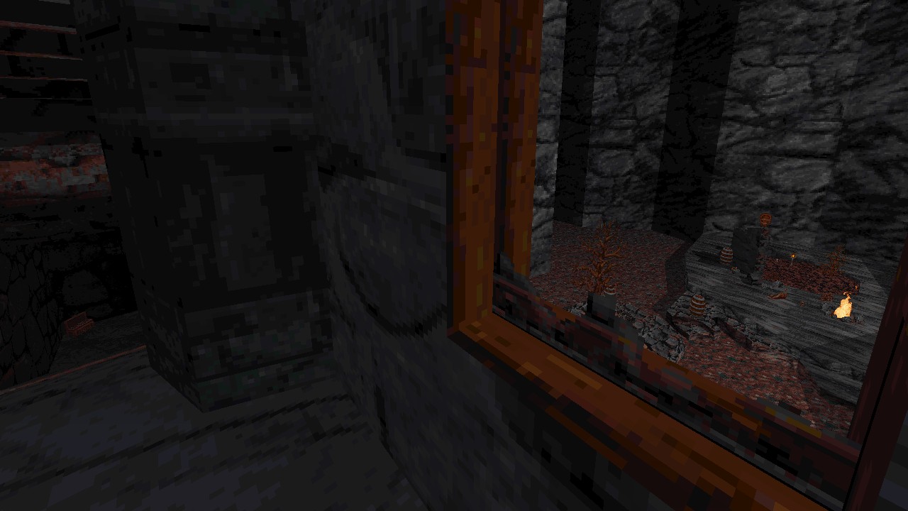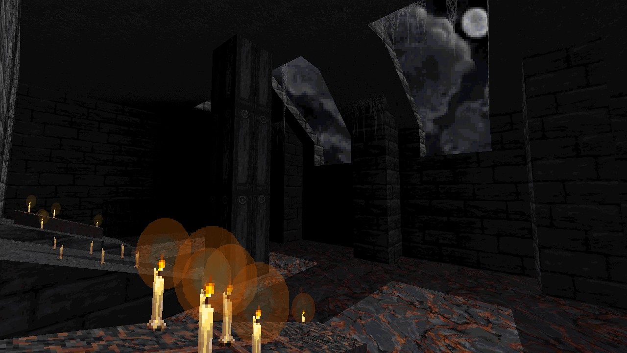 Tekedon originally intended for the level to be part of a larger campaign and based on this experience alone, has caught my curiosity as to how that project might have panned out. WOC creates a solid foundation for its singular adventure oozing with a haunting gothic atmosphere. You start inside a cavern I assume after finding another route leading up to the castle, just outside stands a gatehouse showing signs of dilapidation. Ascending from the never ending chasm is a wide stairway having collapsed away over the years becoming an impossible path to venture from. Anyone choosing to come here now is doing so with a purpose. The portcullis might be shut tight but getting inside won’t be a problem thanks to neglected maintenance. A crumbling wall provides two options, either crawling below through a rat infested tunnel or blowing a hole into a haunted tower. Taking the upper path may prove to be a quicker solution but does pit you up against foes without effective firepower for a short while, while a lower path leading inside the roofed building provides an easy shotgun acquisition that’ll help push back those phantoms loitering above. Everything prior to walking beyond the gates almost seemed like a sneak peek of things to come and got me a little hopeful for similar cases. Turns out progression is more linear than it first lets on, but options dealing with a situation are still placed on the table, designed around combat encounters more so than routing. Progress is tied to key acquisition and often relies too much on backtracking to fill time, the Flame and Eye locks never serve much purpose besides a minor skirmish to grab another key. These small rooms might as well have been side ventures while scouting out, leaving only the important routes locked.